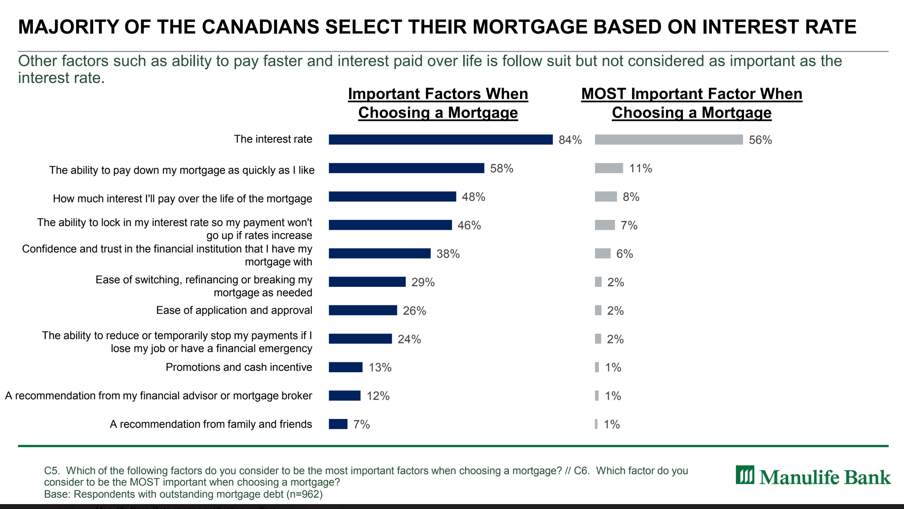 Check out this chart from a recent Manulife survey. Its findings show that the “interest rate” dominates all other factors when consumers pick a mortgage. That’s great news for a rate comparison site like this one, but it’s not great news for borrowers.